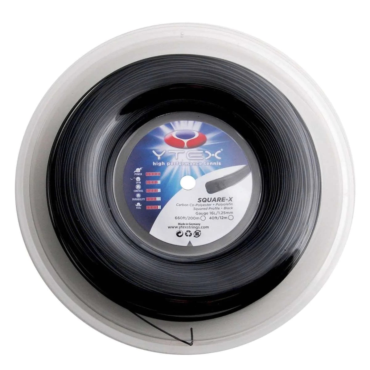This is a square shapes string with Two Flat surfaces, mains/crosses, in contact with each other give extra durability, no notching and the string returns very quickly from any movement after hitting the ball.