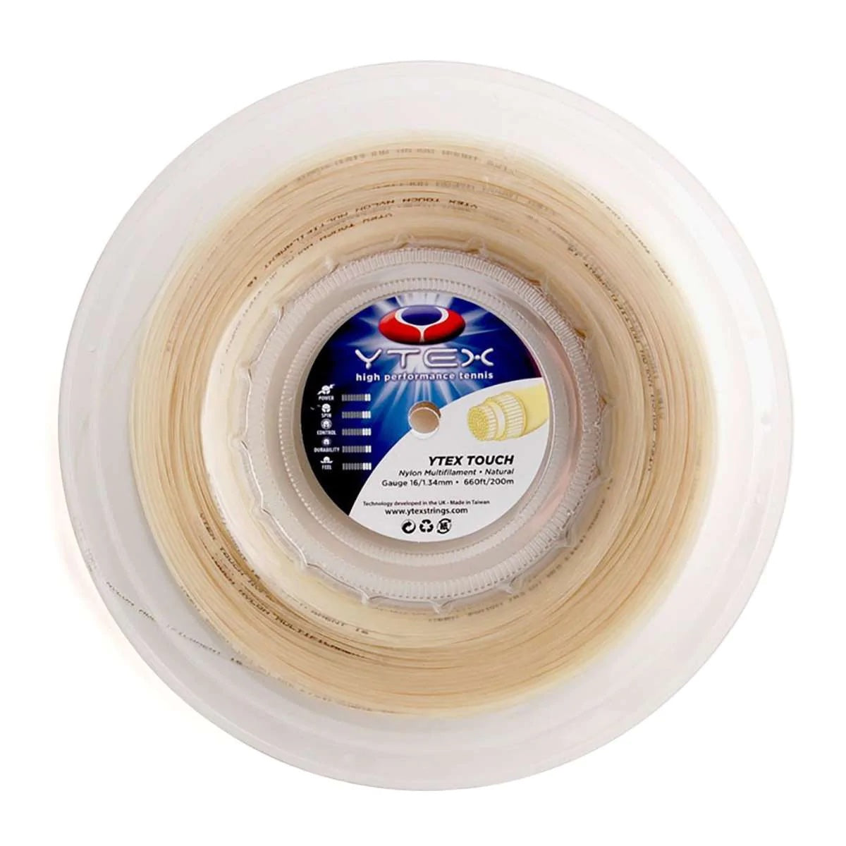 Highly responsive multifilament string for added touch, control, and power. Touch also has a high resistance to string movement. Nylon 66 multifilament core surrounded with a fine row of monofilaments.